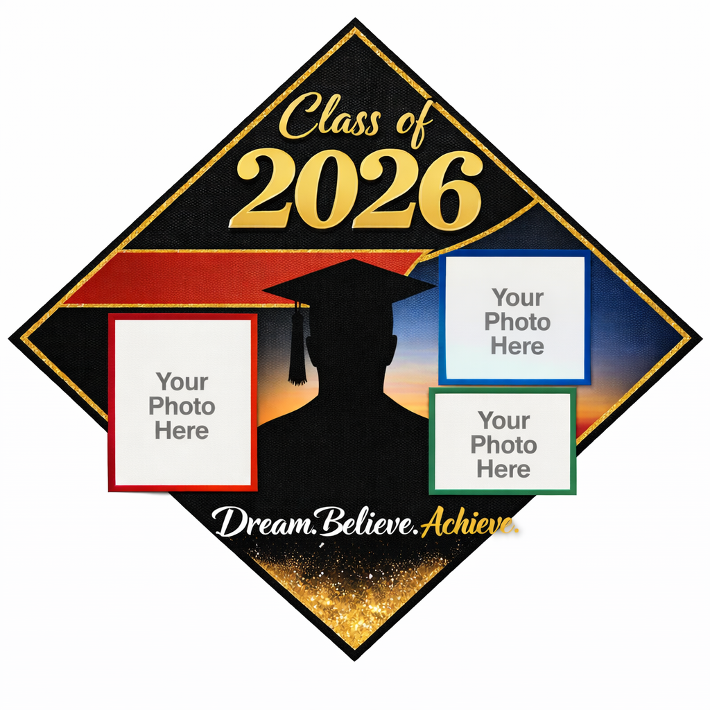 Make graduation day unforgettable with a custom Graduation Cap Topper, professionally printed using high-quality sublimation for vibrant, long-lasting color. This topper is designed to fit perfectly on a standard graduation cap and adds a bold, personal touch to your walk across the stage.